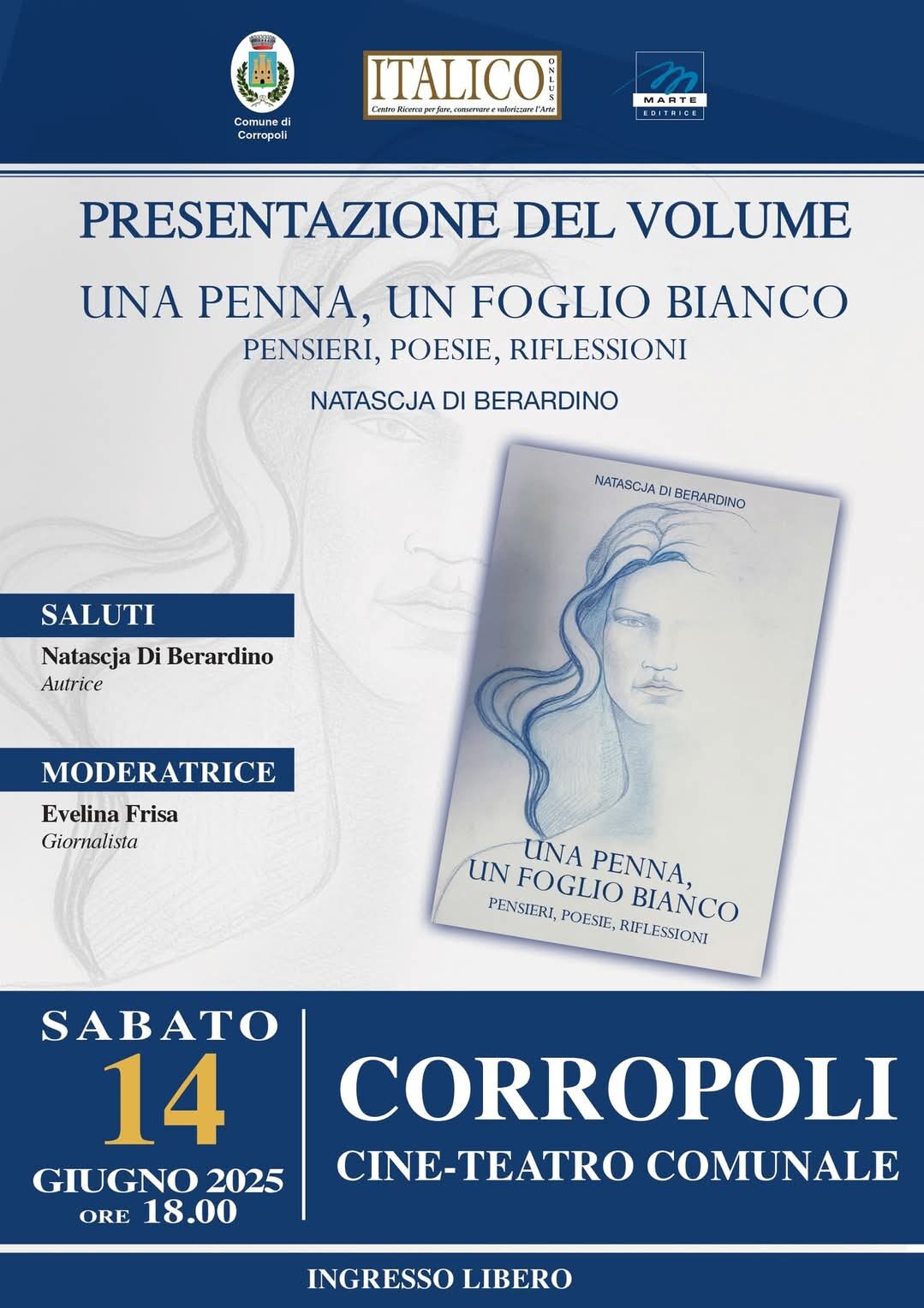 Il secondo appuntamento, invece, è fissato per sabato 14 giugno. Natascja Di Berardino, corropolese e autrice delle poesie virali sui social “Un tempo sarebbe stato facile amarmi” ed “Esiste una stanchezza, quella dell’anima”, che in un dialogo con la giornalista Evelina Frisa, racconterà il suo primo libro Una Penna, un Foglio Bianco (2025), edito dalla Marte Editrice. Una raccolta di pensieri e di poesie, che con grande intensità racconta la potenza di una passione, quella della scrittura, capace di farci scoprire la sua forza come mezzo per esprimere le nostre emozioni ed entrare in relazione con gli altri.