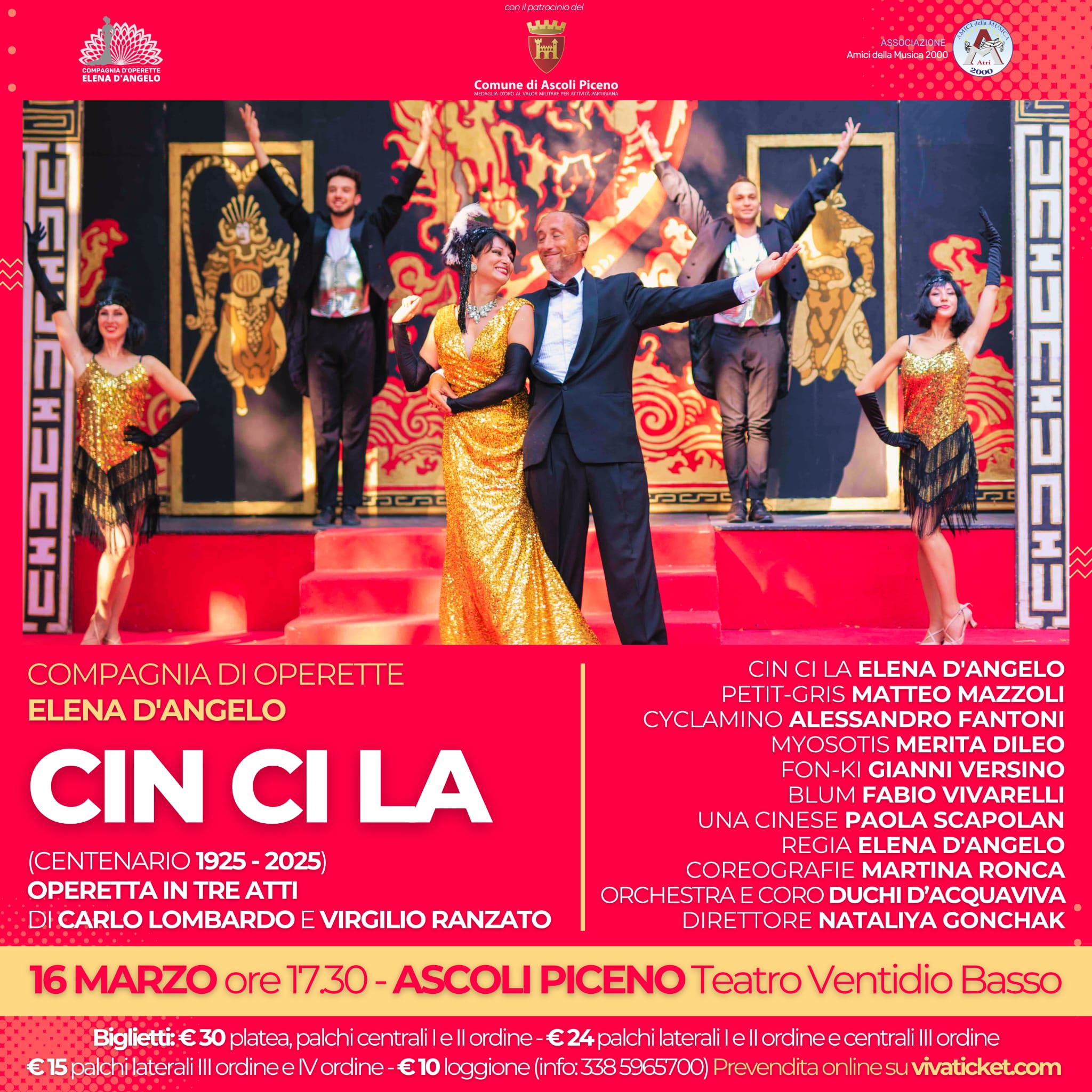 Domenica 16 marzo 2025, alle ore 17.30, presso il Teatro Ventidio Basso di Ascoli Piceno, la Compagnia di Operette Elena D’Angelo e l’Orchestra e il Coro “Duchi d’Acquaviva” con la direzione di Nataliya Gonchak, celebreranno CIN CI LA di Carlo Lombardo e Virgilio Ranzato, nel centenario della prima rappresentazione; un’operetta in tre atti che mantiene il suo fascino con una storia d’amore tra schermaglie e gelosie, che culmina in un lieto fine. Ambientata in luoghi esotici, la sua musica coinvolgente e orecchiabile, unita ad eleganti atmosfere orientali e ritmi di danze americane, la rende un classico intramontabile ed una delle operette più amate dal pubblico.