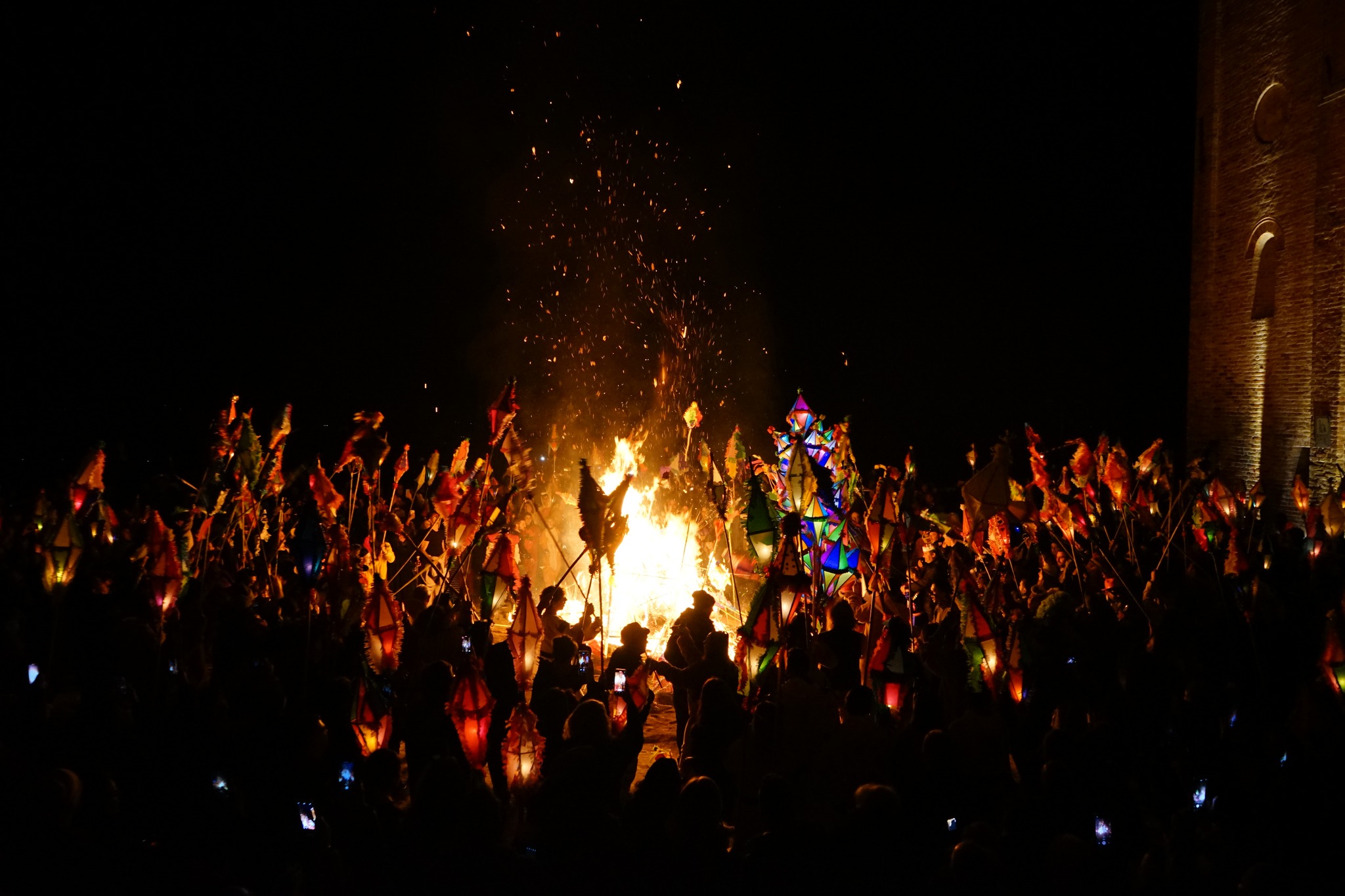 È così che partirà la storica sfilata, quasi una “processione” ma festante e scompigliata, che si snoderà in gran parte del paese al forte grido di “Fora fora li Moccule” ed al ritmo di percussioni, e concluderà la sua marcia in Piazza San Pietro, punto più alto del vecchio incasato. Qui i Moccoli, dopo un’antica liturgia recitata e la battaglia finale (un po’ come a Roma, 250 anni fa, la gara a spegnere il moccolo altrui…) saranno bruciati in un gran falò, saltato come rito propiziatorio dai più giovani.