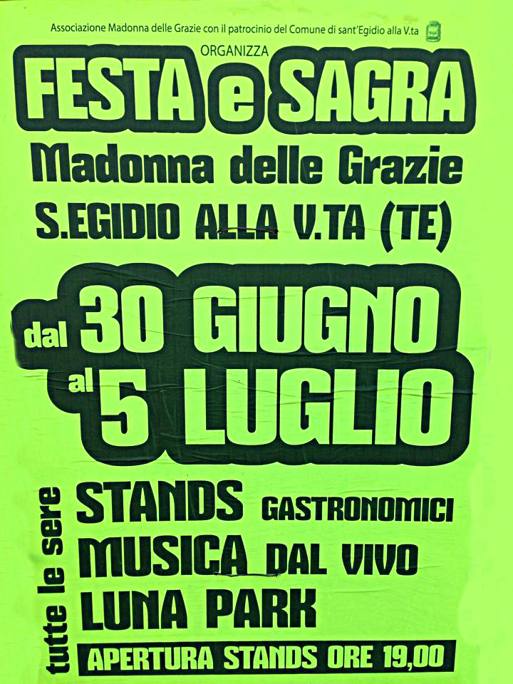 L’Associazione Madonna delle Grazie di S.Egidio presieduta dall’attivo Fabio Paci organizza la festa e sagra annuale presso il parco Belverde difronte Gi E Gi Sport di Marino Marcozzi.