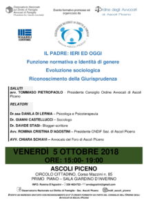 Si terrà Venerdì 5 ottobre 2018 dalle ore 15,00 alle ore 19,00 presso il Circolo Cittadino di Ascoli Piceno, Corso Mazzini n. 85, Sala Giardino d’inverno, il Convegno organizzato dall’Osservatorio Nazionale sul Diritto di Famiglia Sezione di Ascoli Piceno dal titolo: ”Il Padre ieri ed oggi. Funzione normativa e identità di genere. Evoluzione sociologica. Riconoscimento della Giurisprudenza”.