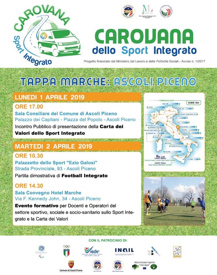 Martedì 2 aprile, alle ore 10.30 alle 12.30 presso il Palazzetto dello Sport “Enzo Galosi” dimostrazione di Football integrato preceduta dall’esibizione di scherma in carrozzina, con due atleti dell’Accademia Scherma di Fermo, seguiti da Carlo Millevolte, allenatore della nazionale paraolimpica di fioretto.
