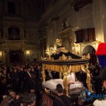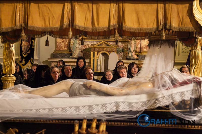 La bara è preceduta dalla Croce e dai simboli della passione, dalle sette parole dette da Gesù, dalle vergini vestite di bianco, dalle pie donne con i loro lamenti, dalle ragazze con le sette spade, dalla banda musicale, dalle autorità religiose e civili, dalla statua di San Giovanni, dalla p reziosa statua della Madonna Addolorata.