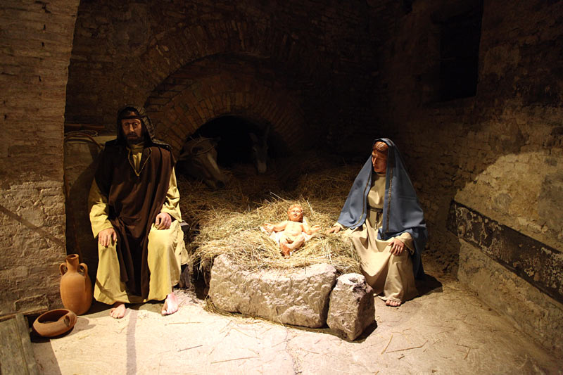 Entrando, in primo piano la Sacra Famiglia domina la scena; una luce calda evidenzia Gesù bambino realizzato, in terracotta policroma (così come testa, mani e piedi di Giuseppe e Maria) dallo scultore Silvano Pizza. Ci sono poi la mangiatoia, il bue e l’asinello costruiti tanti anni or sono da Primo Scipioni e Claudio Lazzarini. Un fascino particolare ha il pastore che esce dalla galleria con in mano una Lucerna Bizantina creata per l’occasione dai ceramisti Gianfranco Neve e Aristea Fioravanti. Gli abiti sono stati realizzati dalla sartoria storica locale Il Sarto del Carnevale.