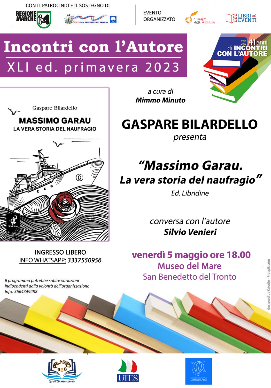 Gaspare Bilardello presenterà il libro “Massimo Garau la vera storia del naufragio” Venerdì 5 Maggio alle ore 18 al Museo del Mare. Conversa con lo Scrittore Silvio Venieri, segretario dell’Ass. I luoghi della Scrittura. Saranno presenti: On. Nicolò Cristaldi, Già Presidente dell’ ARS (Assemblea Regionale Siciliana ); Già Deputato al Parlamento Nazionale (tre volte) Già Deputato Regionale Siciliano (più volte) Già Sindaco di Mazara del Vallo (TP) (due volte)Già Sindaco di Calatafimi Segesta (TP) (due volte).Presidente, della Fondazione Federico II di Palermo, organo culturale dell’Assemblea regionale siciliana, ente organizzatore di eventi culturali internazionali oltre a mostre dei maggiori pittori e scultori contemporanei. Ha ricevuto diverse onorificenze e dal 1998 è Cavaliere de la Gran Cruz dell’Ordine di Isabella la Cattolica, insignito dal Re Juan Carlos I di Spagna in visita a Palermo