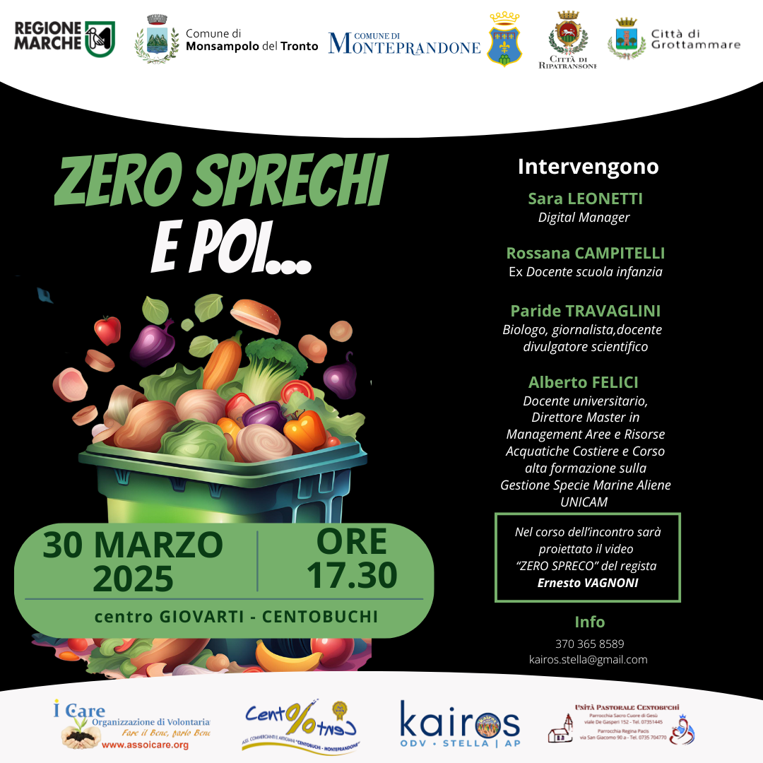 Il Comune di Monteprandone, capofila del progetto “Zero Spreco”, è lieto di invitare la cittadinanza all’incontro “ZERO SPRECHI E POI…”, che si terrà domenica 30 marzo 2025, alle ore 17:30, presso il Centro Giovarti di Centobuchi. Un evento pensato per sensibilizzare la comunità sul tema dello spreco alimentare e promuovere stili di vita sostenibili.