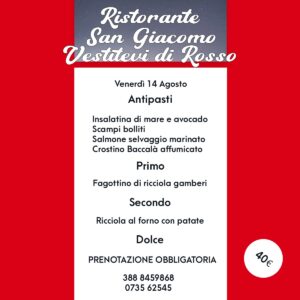 Sabato 15 e Domenica 16, invece, saranno un vero e proprio Inno alle Marche: prodotti tipici della nostra regione, uniti ai piatti che hanno reso celebre il Ristorante San Giacomo, come il roast beef di marchigiana e la caponata antica. Il colore simbolo di queste serate sarà il bianco, rappresentazione della libertà e della creatività.