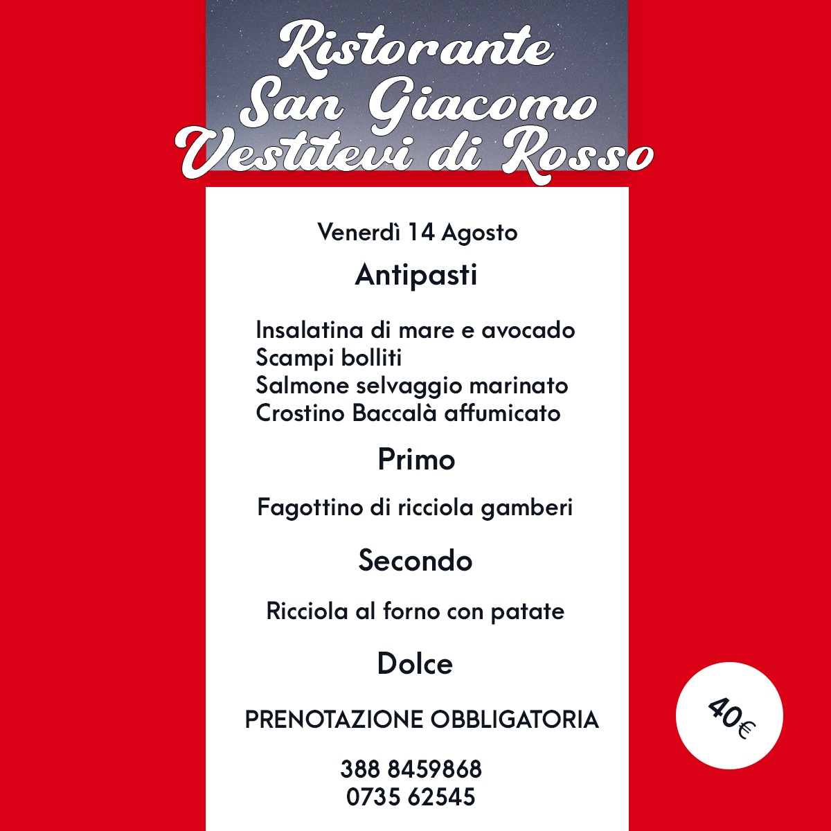 Sabato 15 e Domenica 16, invece, saranno un vero e proprio Inno alle Marche: prodotti tipici della nostra regione, uniti ai piatti che hanno reso celebre il Ristorante San Giacomo, come il roast beef di marchigiana e la caponata antica. Il colore simbolo di queste serate sarà il bianco, rappresentazione della libertà e della creatività.