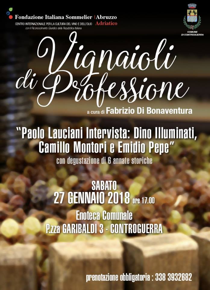 Sabato 27 Gennaio 2017 alle ore 17:00 presso l’Enoteca comunale del Comune di Controguerra si terrà l’iniziativa dal titolo “Vignaioli di Professione”. L’evento, nato da un idea del Fiduciario della Fondazione Italiana Sommelier della Provincia di Teramo il Sommelier Fabrizio Di Bonaventura, verrà moderato dal Giornalista Bibenda, docente Fondazione Italiana Sommelier Paolo Lauciani e sarà patrocinato dal Comune di Controguerra Assessorato alla Cultura e Città del Vino.